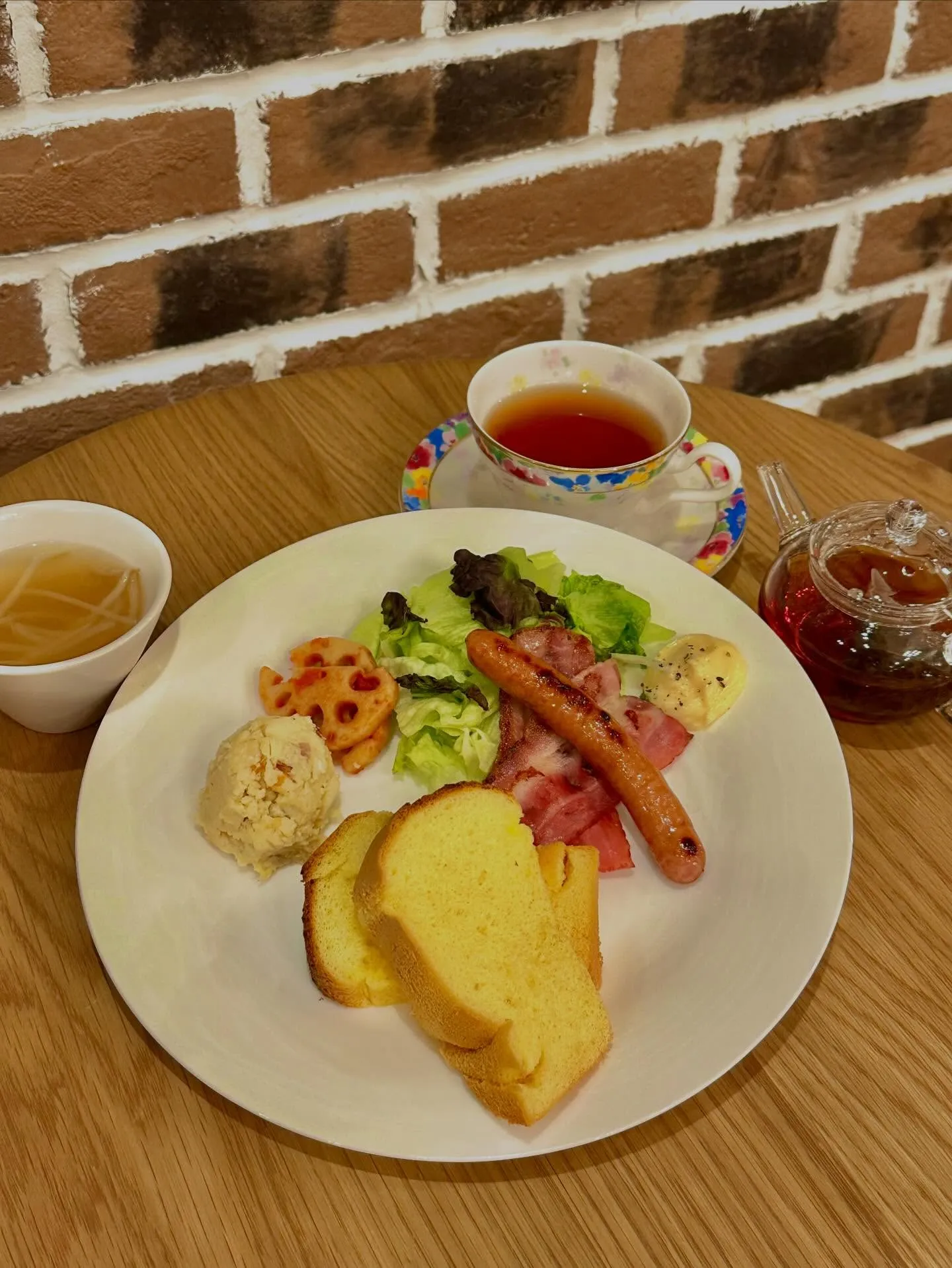 甘さ控えめでほんのり塩味のきいたシフォンに、ベーコンやソーセージ、サラダを一緒に食べると、口の中で甘さと塩っぱさが混ざりとっても美味しい1品です😋
